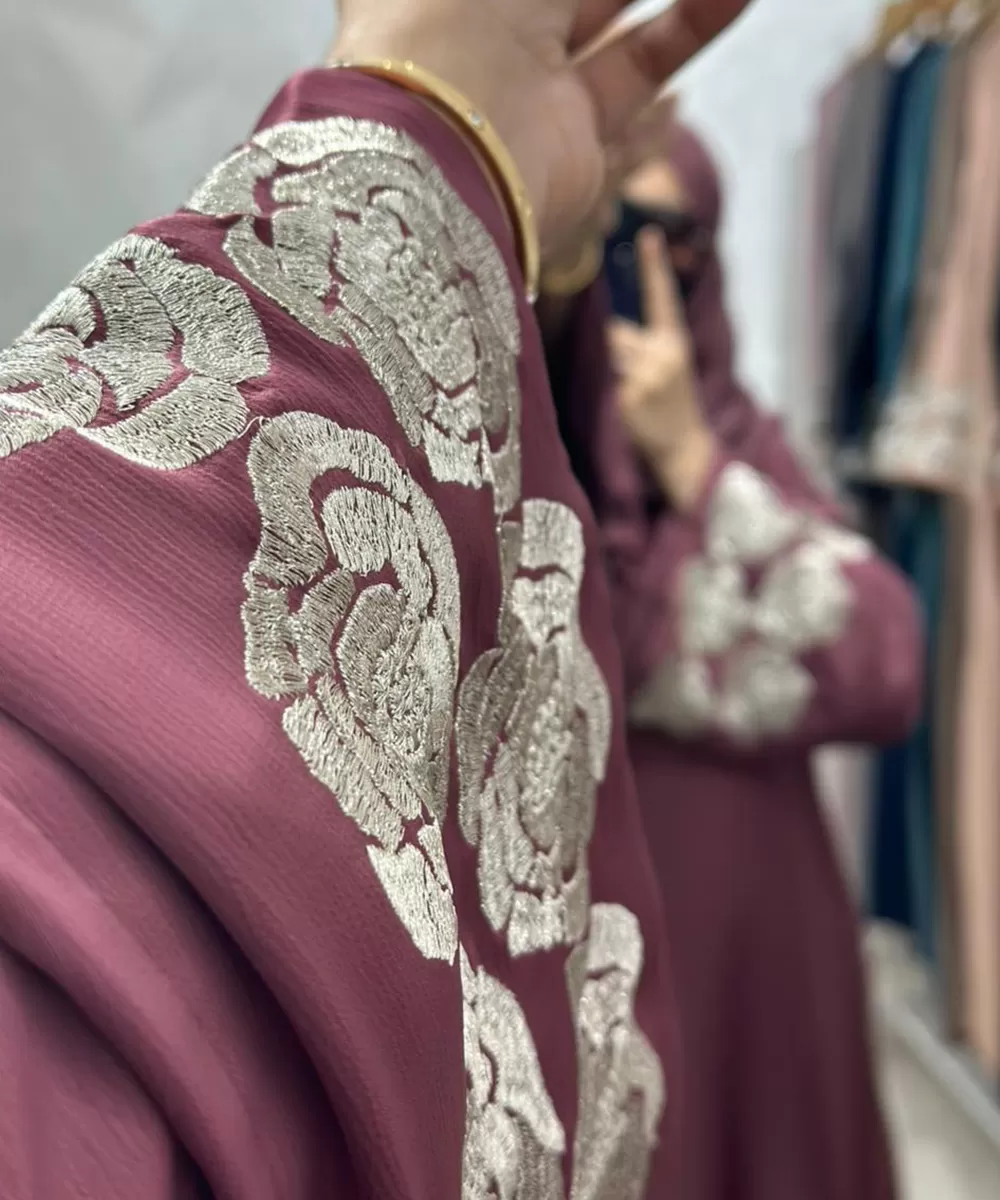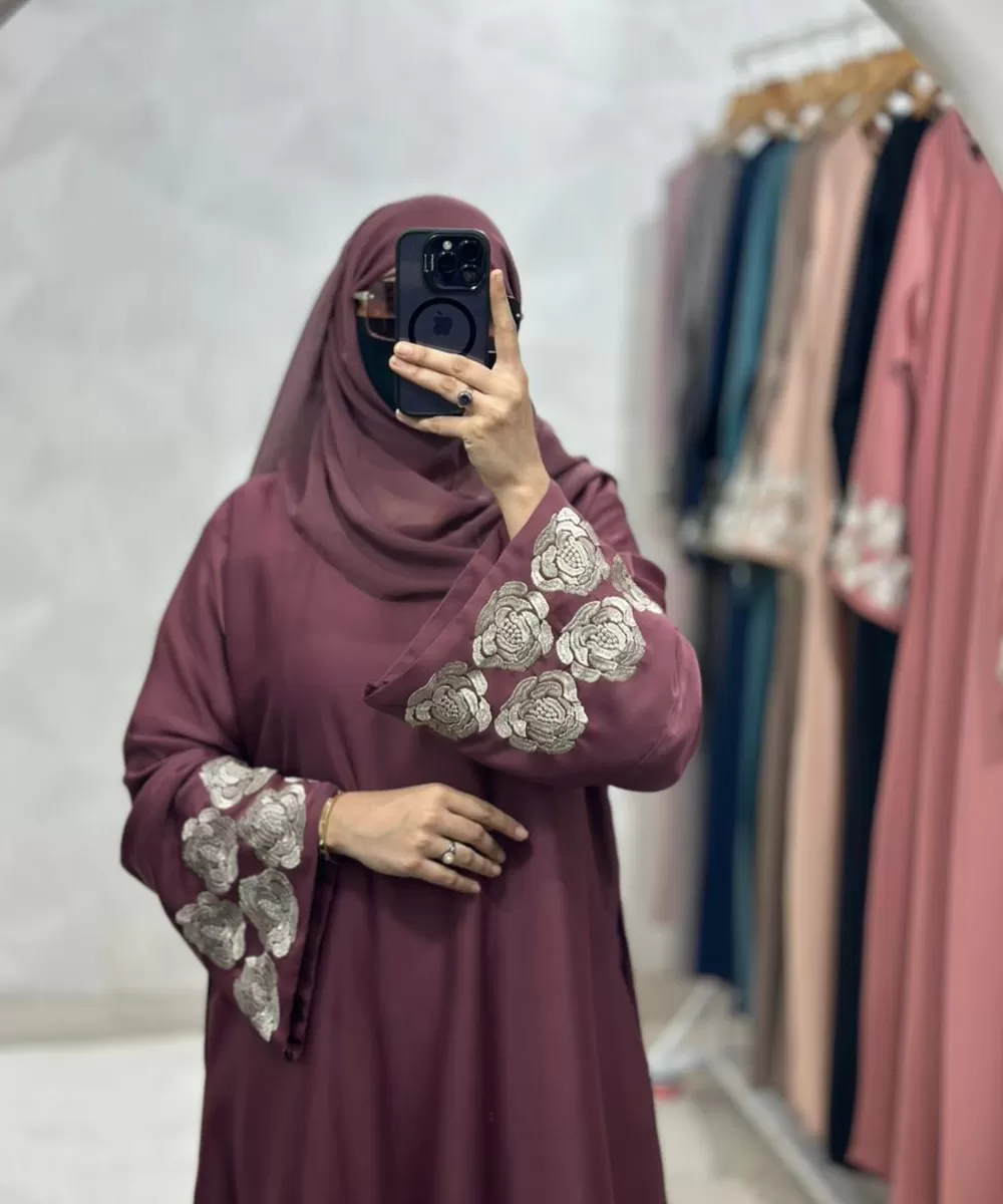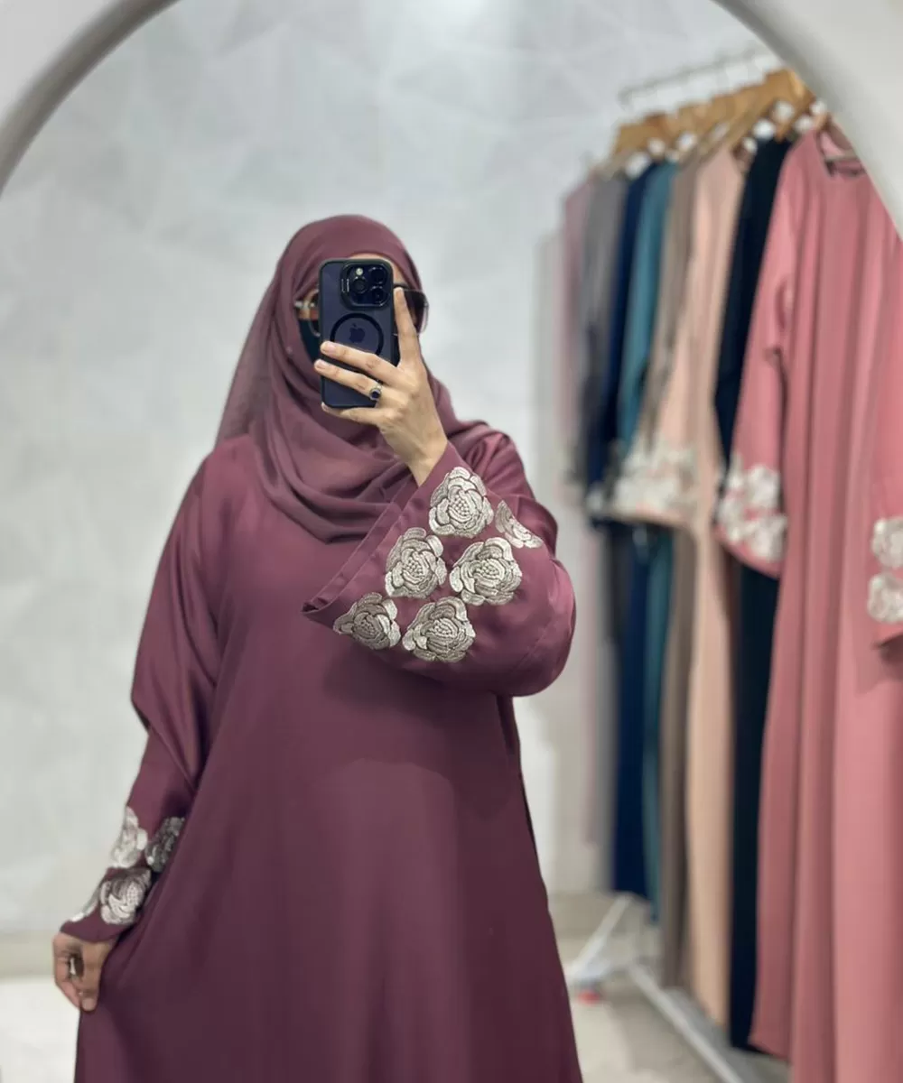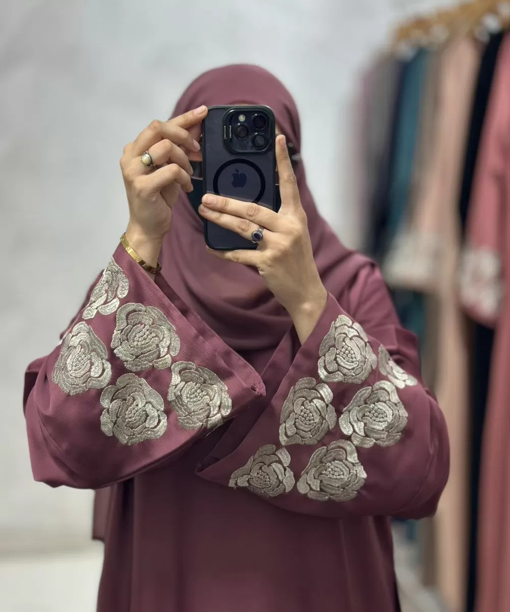 Step into refined elegance with this stunning embroidered maroon abaya, beautifully crafted to make every look graceful and stylish. The rich maroon shade paired with intricate floral embroidery on the sleeves adds a luxurious and feminine touch. Made from premium imported fabric, it offers a smooth and comfortable drape, perfect for long wear. The matching sheila enhances its charm, creating a polished and coordinated ensemble. Ideal for festive gatherings, formal occasions, or evening outings this abaya perfectly blends modesty with modern sophistication, making it a timeless addition to your wardrobe.