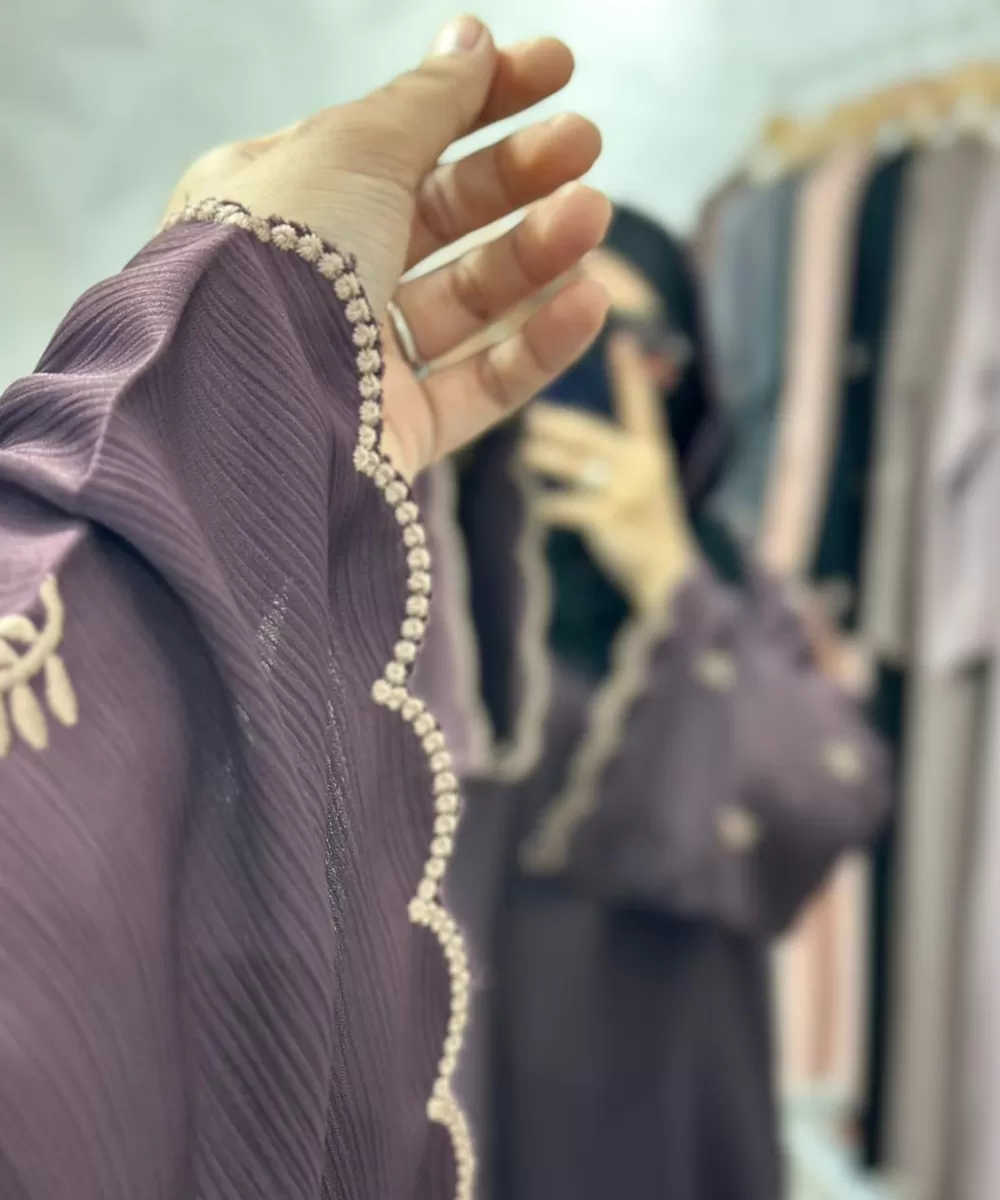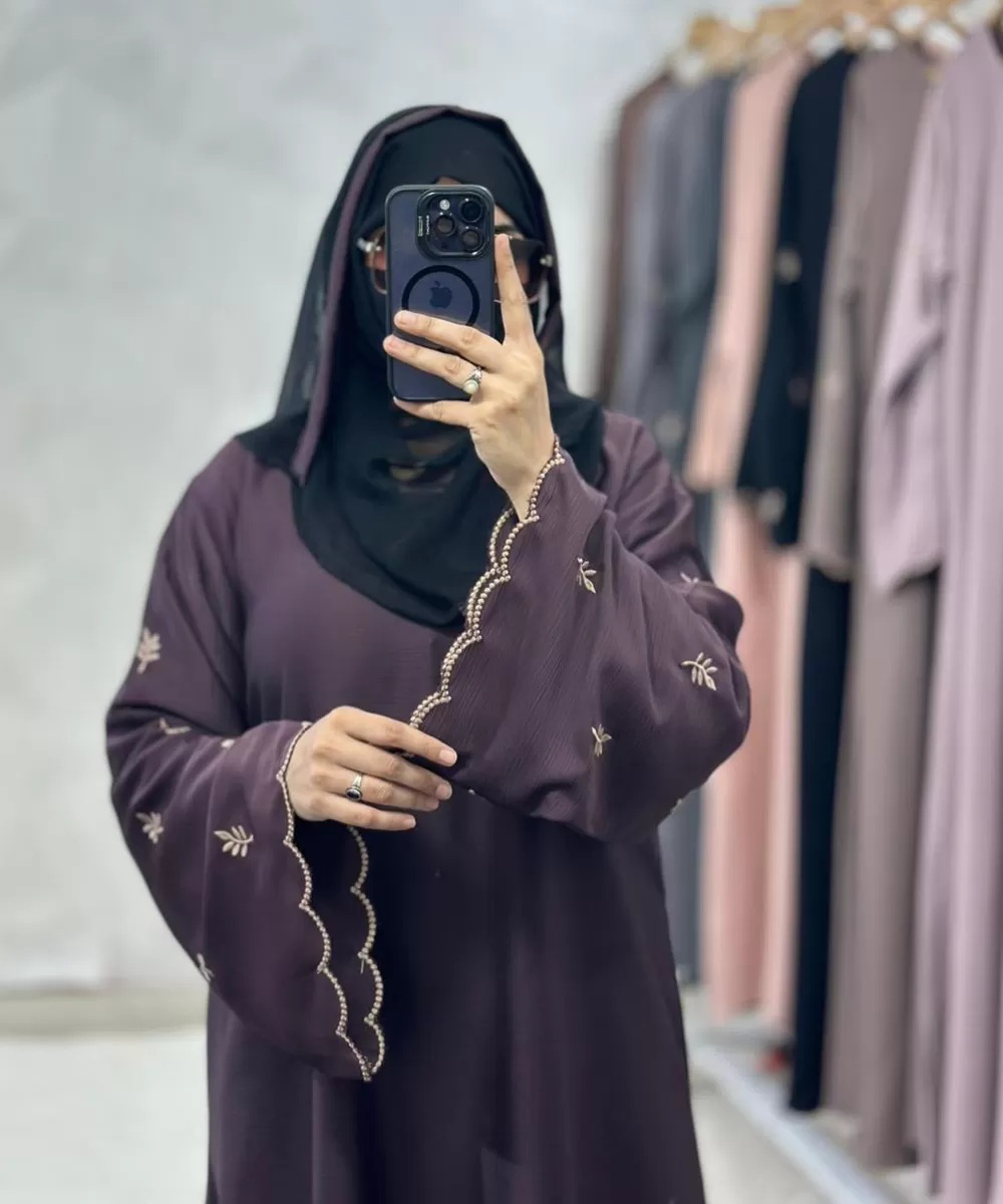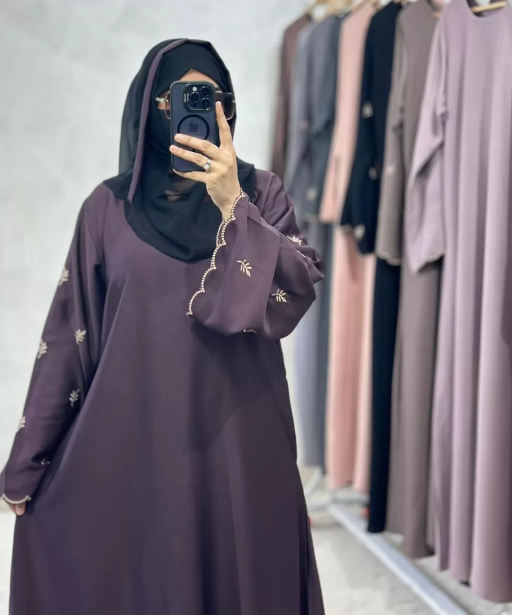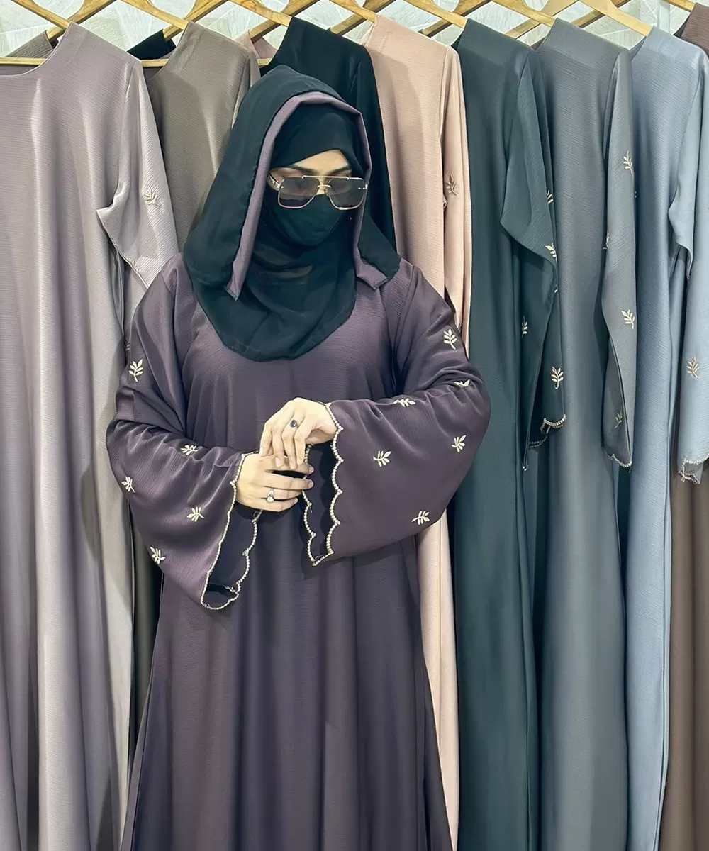 Step into everyday elegance with this soft plum embroidered abaya, designed for women who love comfort with a hint of sophistication. The delicate embroidery on the bell sleeves and scalloped edges adds a graceful charm, while the flowy fabric ensures effortless movement throughout the day. Its subtle shine and refined detailing make it perfect for both casual outings and semi-formal occasions. Paired with a contrasting black sheila, this abaya offers a timeless balance of modesty and modern elegance a versatile choice for those who appreciate beauty in simplicity.